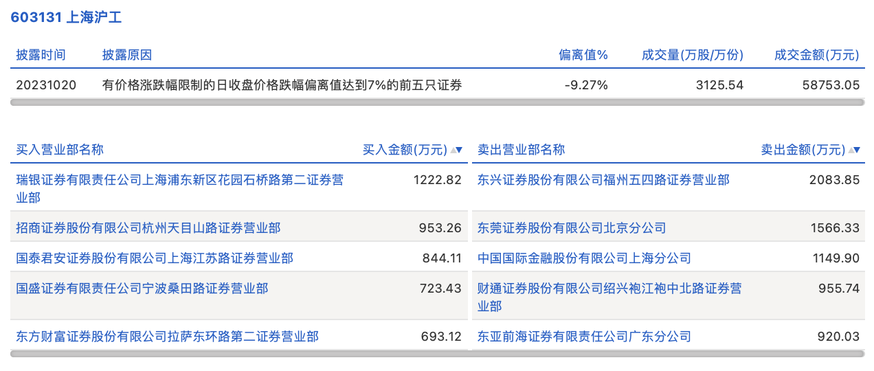 10月20日,上海沪工今日跌停,龙虎榜数据显示,上榜营业部席位全天成交1.11亿元,占当日总成交金额比例为18.91%。其中,买入金额为4436.75万元,卖出金额为6675.85万元,合计净卖出2239.1万元。