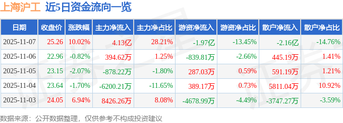 证券之星消息,上海沪工11月7日涨停收盘,收盘价25.26元。该股于10点32分涨停,3次打开涨停,截止收盘封单资金为6702.24万元,占其流通市值0.83%。