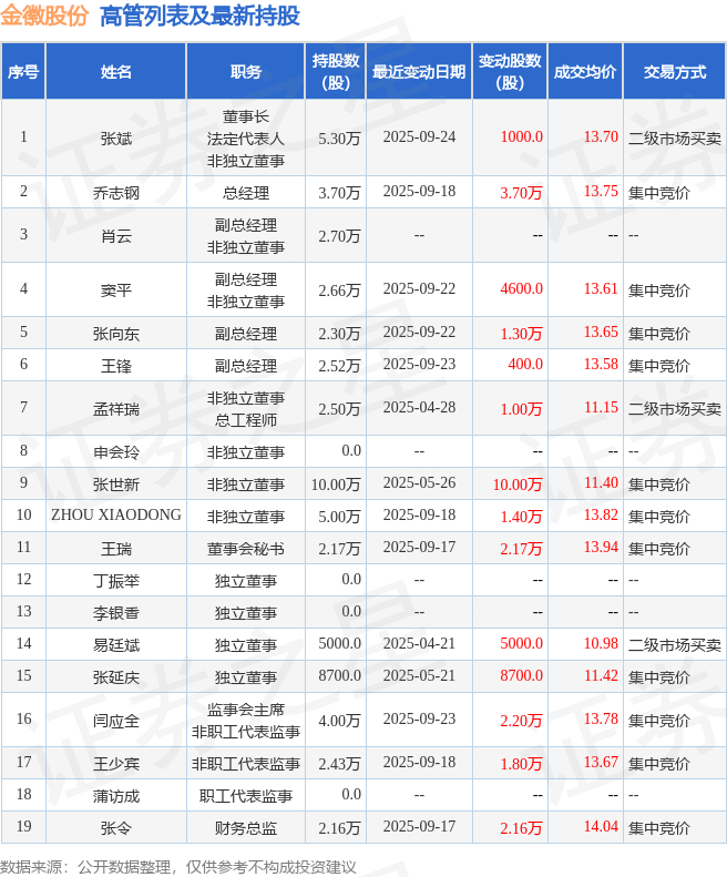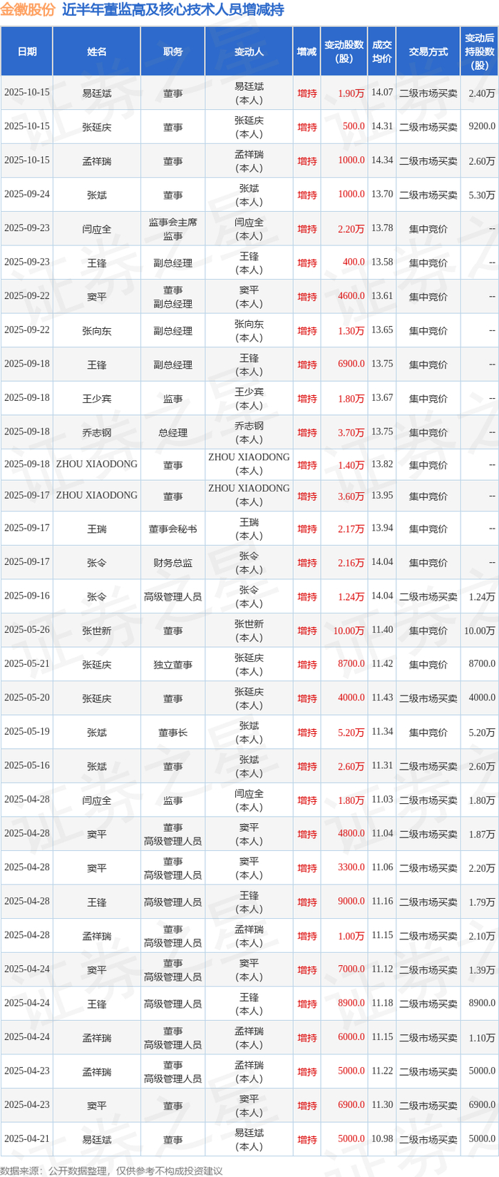 金徽股份近半年内的董监高及核心技术人员增减持详情如下: