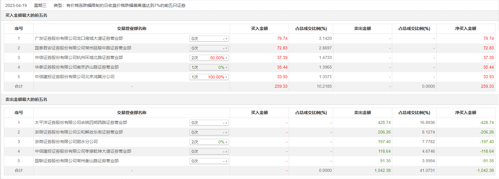 4月19日,碳元科技今日跌停,龙虎榜数据显示,上榜营业部席位全天成交1301.71万元,占当日总成交金额比例为51.29%。其中,买入金额为259.33万元,卖出金额为1042.38万元,合计净卖出783.05万元。具体来看,太平洋证券余姚四明西路证券营业部、浙商证券云和解放东街证券营业部分别卖出428.74万元、206.26万元;广发证券龙口港城大道证券营业部、国泰君安证券常州延陵中路证券营业部分别买入79.74万元、72.83万元。