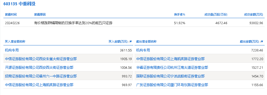 2月26日,中重科技今日跌1.17%,龙虎榜数据显示,上榜营业部席位全天成交2.16亿元,占当日总成交金额比例为23.06%。其中,买入金额为8484.99万元,卖出金额为1.31亿元,合计净卖出4663.25万元。
