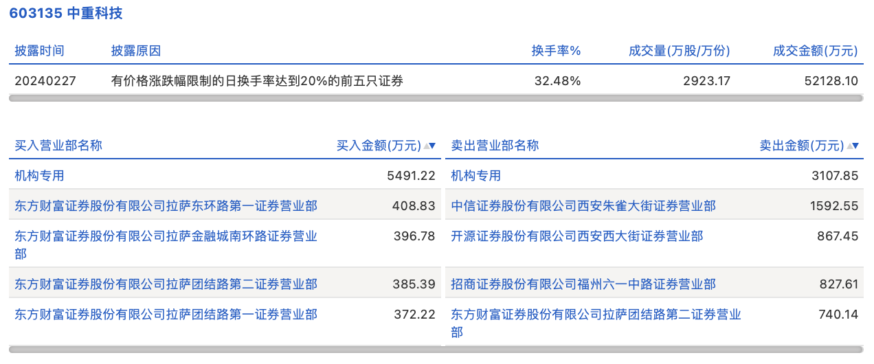 2月27日,中重科技今日跌1.88%,龙虎榜数据显示,上榜营业部席位全天成交1.42亿元,占当日总成交金额比例为27.22%。其中,买入金额为7054.44万元,卖出金额为7135.6万元,合计净卖出81.16万元。