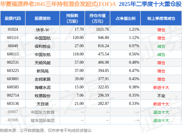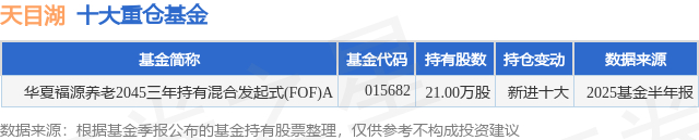 根据2025基金半年报公募基金重仓股数据,重仓该股的公募基金共1家,其中持有数量最多的公募基金为华夏基金的华夏福源养老2045三年持有混合发起式(FOF)A。华夏福源养老2045三年持有混合发起式(FOF)A目前规模为7.86亿元,最新净值0.8911(9月18日),较上一交易日下跌0.75%,近一年上涨20.39%。该公募基金现任基金经理为许利明 潘更。许利明在任的基金产品包括:华夏养老2040三年持有混合(FOF)A,管理时间为2018年9月13日至今,期间收益率为45.69%;华夏养老2045(FOF)A,管理时间为2019年4月9日至今,期间收益率为48.6%;华夏养老2055五年持有混合(FOF)A,管理时间为2021年5月18日至今,期间收益率为-18.02%;华夏安盈稳健养老目标一年持有混合(FOF)A,管理时间为2021年10月15日至今,期间收益率为2.52%。潘更在任的基金产品包括:华夏稳健养老一年持有混合(FOF)A,管理时间为2025年2月24日至今,期间收益率为5.56%;