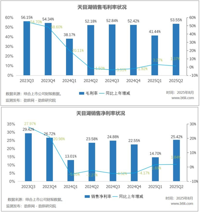 天目湖销售毛利率53.55%,同比上年增长1.37个百分点。销售净利率25.42%,同比上年增加1.84个百分点。