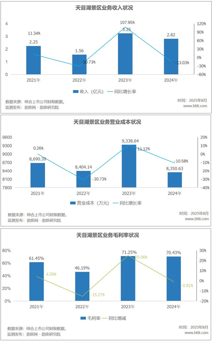 其中,景区业务实现营业收入为2.82亿元,同比下降13.03%。营业成本8350.63万元,同比下降10.58%。毛利率70.43%,同比上年下降0.81个百分点。