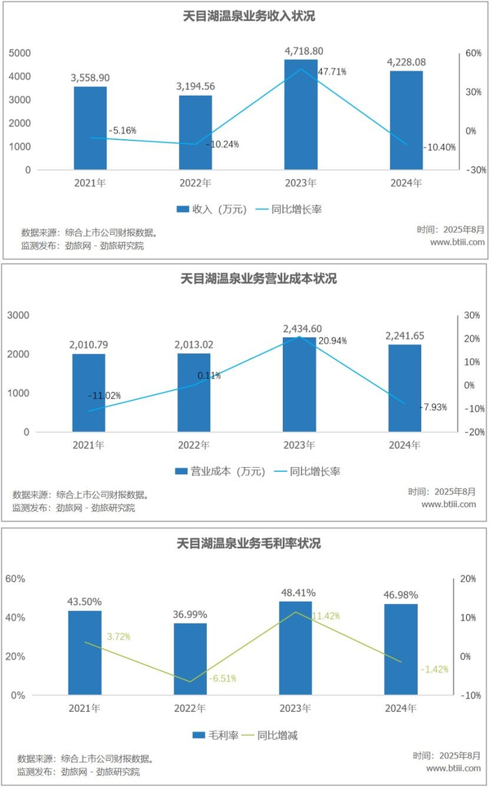 温泉业务实现营业收入4228.08万元,同比上年下降10.40%。营业成本为2241.65万元,同比下降7.93%。毛利率46.98%,同比下降1.42个百分点。