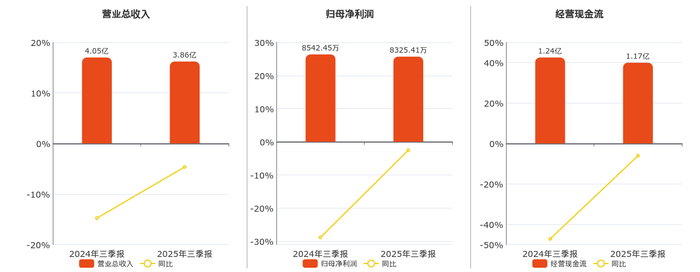 公司营业总收入为3.86亿元,较去年同报告期营业总收入减少1883.19万元,同比较去年同期下降4.65%。归母净利润为8325.41万元,较去年同报告期归母净利润减少217.04万元,同比较去年同期下降2.54%。经营活动现金净流入为1.17亿元,较去年同报告期经营活动现金净流入减少756.10万元,同比较去年同期下降6.08%。
