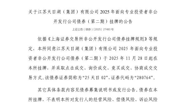 依据《上海证券交易所非公开发行公司债券挂牌规则》等规定,上交所同意江苏天目湖(集团)有限公司2025年面向专业投资者非公开发行公司债券(第二期)于2025年11月28日起在上交所挂牌,并采取点击成交、询价成交、竞买成交、协商成交交易方式。该债券证券简称为“25天目02”,证券代码为“280764”。