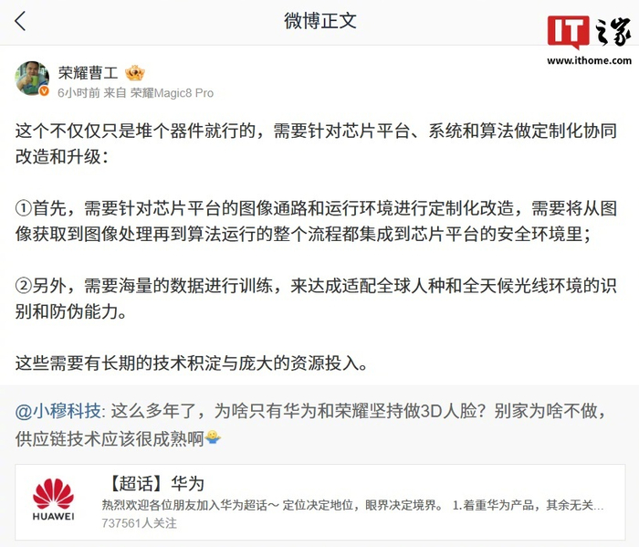 【#荣耀研发工程师解释为何别家不做3D人脸#:需要长期技术积淀与庞大资源投入】11 月 26 日消息,博主 @小穆科技 询问:“这么多年了,为啥只有华为和荣耀坚持做 3D 人脸?别家为啥不做,供应链技术应该很成熟啊。”荣耀研发工程师 @荣耀曹工 今日发文解答了这一问题。这个不仅仅只是堆个器件就行的,需要针对芯片平台、系统和算法做定制化协同改造和升级: