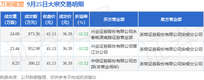 9月25日万朗磁塑现3笔折价11.52%的大宗交易 合计成交2026.56万元