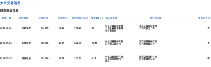 9月25日,万朗磁塑大宗交易成交55.69万股,成交额2026.56万元,占当日总成交额的6.99%,成交价36.39元,较市场收盘价41.13元折价11.52%。