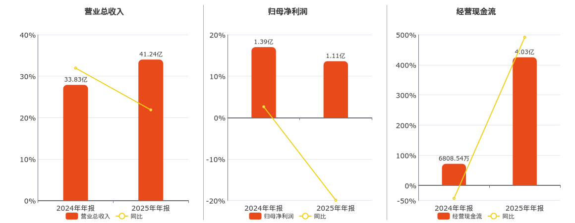 公司营业总收入为41.24亿元。归母净利润为1.11亿元,较去年同报告期归母净利润减少2770.12万元,同比较去年同期下降19.92%。经营活动现金净流入为4.03亿元。