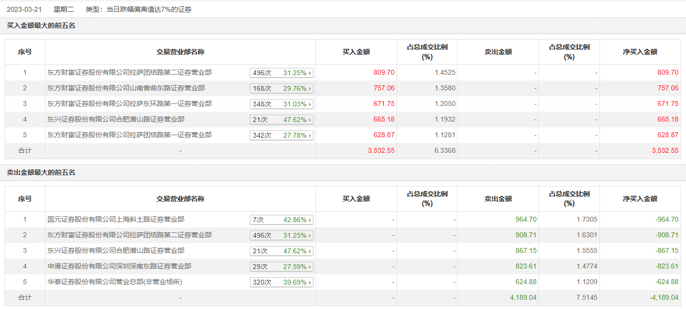 具体来看,国元证券上海斜土路证券营业部、东方财富证券拉萨团结路第二证券营业部分别卖出964.70万元、908.71万元;东方财富证券拉萨团结路第二证券营业部、东方财富证券山南香曲东路证券营业部分别买入809.70万元、757.06万元。