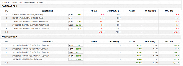 具体来看,东方财富证券拉萨团结路第二证券营业部、东方财富证券山南香曲东路证券营业部分别卖出802.00万元、777.03万元;华泰证券总部、国盛证券杭州金城路证券营业部分别买入849.27万元、824.12万元。