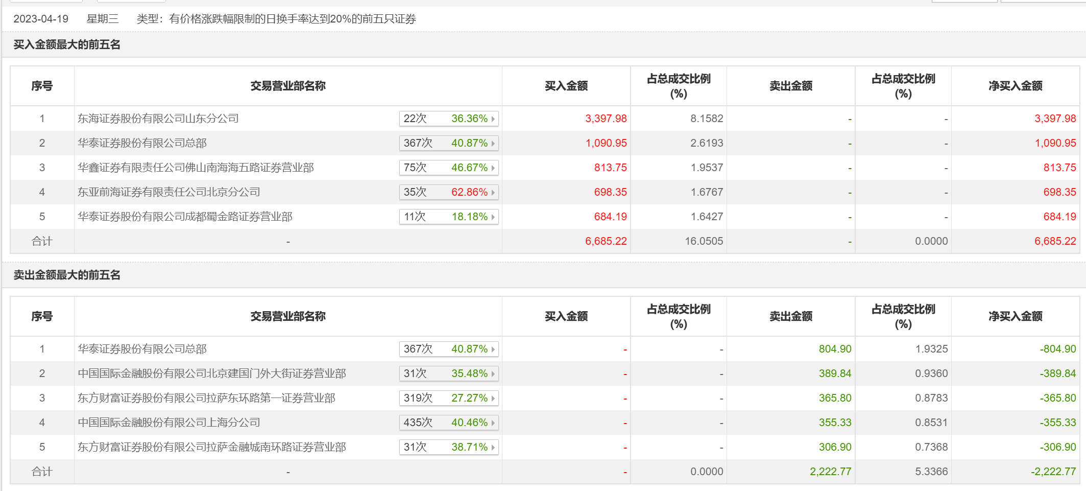 具体来看,东海证券山东分公司、华泰证券总部分别买入3397.98万元、1090.95万元;华泰证券总部、中国国际金融北京建国门外大街证券营业部分别卖出804.90万元、389.84万元。