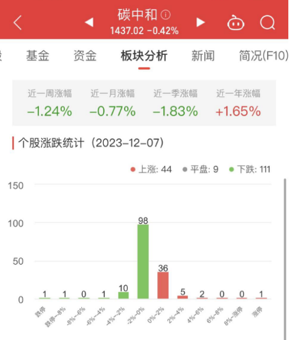 中国经济网北京12月7日讯今日,碳中和板块整体跌幅0.42%,其中44只股票上涨,9只股票平盘,111只股票下跌。