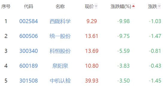 西陇科学、统一股份、科恒股份、泉阳泉、中机认检位列板块涨幅榜后五位,涨幅分别为-9.98%、-9.75%、-5.59%、-3.83%、-3.50%。