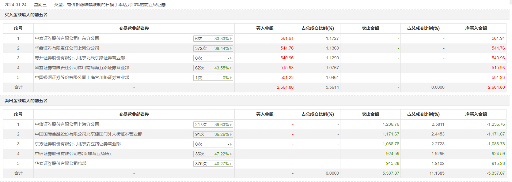 1月24日,上海建科今日涨停,全天换手率达45.34%,振幅达7.84%。龙虎榜数据显示,营业部席位合计净卖出2672.28万元。其中,中泰证券广东分公司、华鑫证券上海分公司分别买入561.91万元、544.76万元;中信证券上海分公司、中国国际金融北京建国门外大街证券营业部分别卖出1236.76万元、1171.67万元。