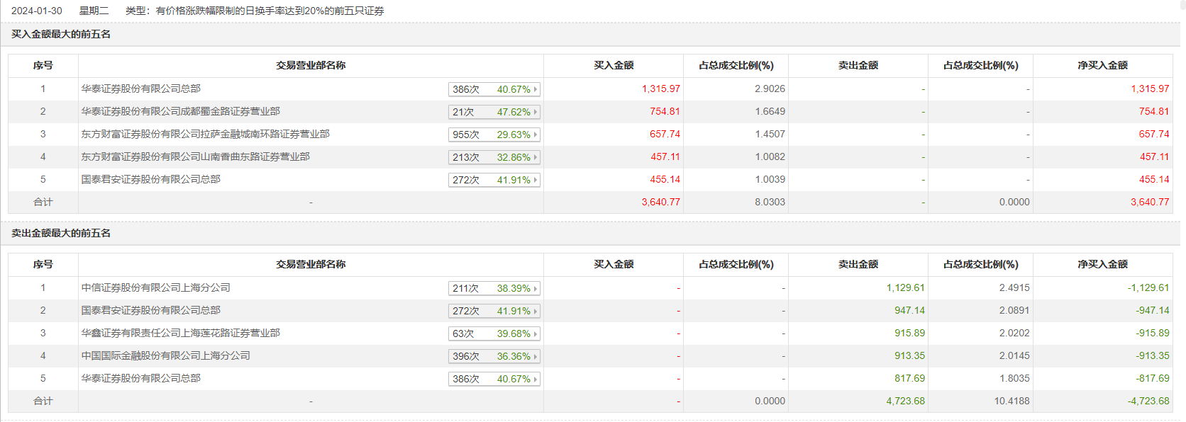 1月30日,上海建科今日跌停,全天换手率达39%,振幅达4.92%。龙虎榜数据显示,营业部席位合计净卖出1082.91万元。其中,中信证券上海分公司、国泰君安证券总部分别卖出1129.61万元、947.14万元;华泰证券总部、华泰证券成都蜀金路证券营业部分别买入1315.97万元、754.81万元。