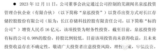 养元饮品在今年9月发布的公告上称,2023年12月,养元饮品决定通过公司控制的泉泓投资以货币出资方式,对长江存储控股股份有限公司增资16亿元,该公司为半导体行业中的领军企业,而截止目前,泉泓投资持有该公司0.98%的股份。