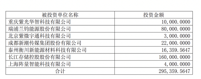 泉泓投资于2021年6月2日在中国证券投资基金业协会办理了备案登记,目前已投资7家公司:重庆紫光华智科技有限公司1亿元、瑞浦兰钧能源股份有限公司8亿元、北京紫微宇通科技有限公司3000万元、新潮传媒2.2亿元、泰州衡川新能源材料科技有限公司约1.64亿元、长江存储16亿元、上海阵量智能科技有限公司4000万元。