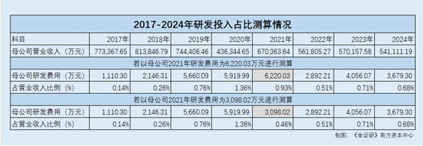 换言之,2017-2024年,养元饮品母公司或亦不存在研发费用资本化情况,其研发费用等于其研发投入。期间,养元饮品母公司除了2020年研发投入占比为1.36%外,其他年份的研发投入占比均不足1%。