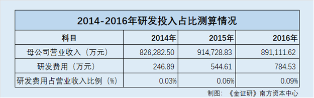 在取最大值的情况下,即倘若养元饮品的合并报表范围的研发投入等于其母公司研发投入,经测算,则2014-2016年,养元饮品母公司的研发投入占比或分别为0.03%、0.06%、0.09%。
