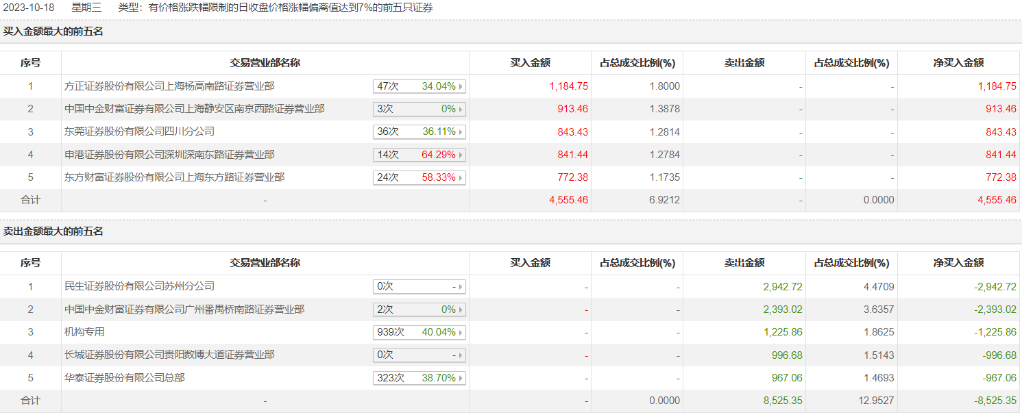 腾龙股份10月18日涨停,全天换手率达15.12%,振幅达12.7%。龙虎榜数据显示,营业部席位合计净卖出3969.89万元。其中,机构合计净卖出1225.86万元。此外,方正证券上海杨高南路证券营业部、中国中金财富证券有限公司上海静安区南京西路证券营业部分别买入1184.75万元、913.46万元;民生证券苏州分公司、中国中金财富证券有限公司广州番禺桥南路证券营业部分别卖出2942.72万元、2393.02万元。