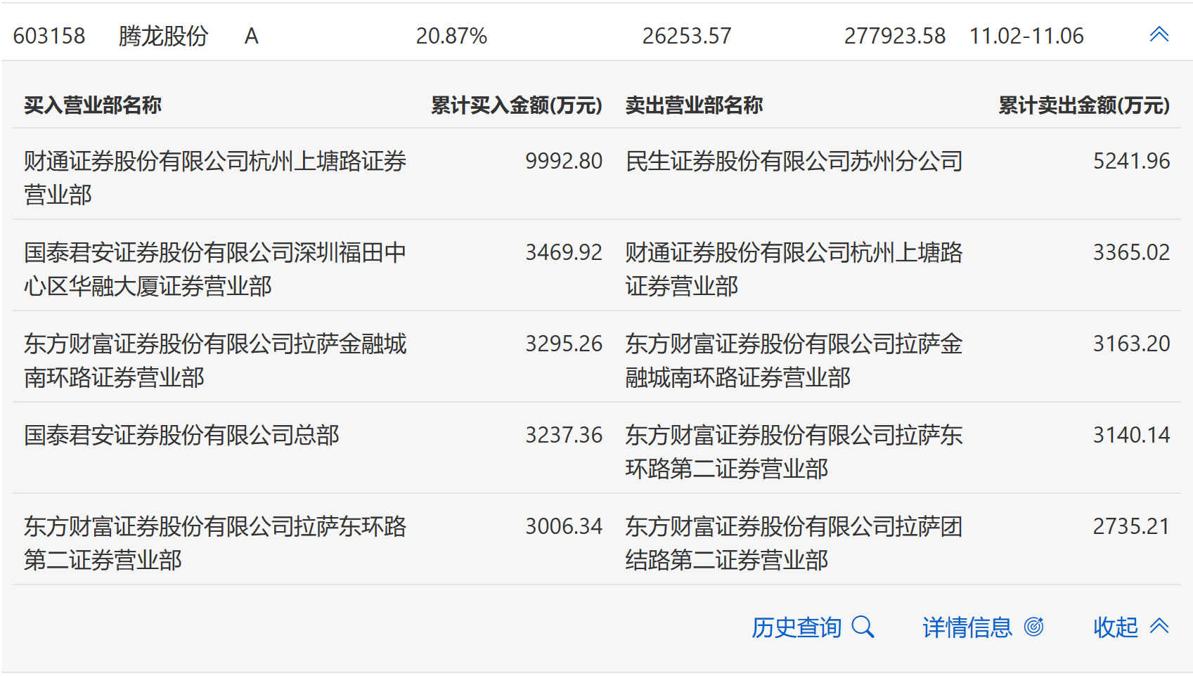 11月6日,腾龙股份今日涨停,全天换手率达14.84%,振幅达9.47%。龙虎榜数据显示,营业部席位合计净买入3315.51万元。其中,财通证券杭州上塘路证券营业部、国泰君安证券总部分别买入5921.50万元、1528.02万元;民生证券苏州分公司、国泰君安证券总部分别卖出2315.99万元、1187.62万元。
