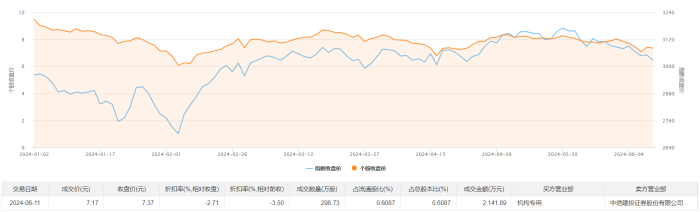 6月11日大宗交易成交298.73万股,成交额2141.89万元,占当日总成交额的31.35%,成交价7.17元,较市场收盘价7.37元折价2.71%。