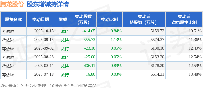 截至2025年10月15日收盘,腾龙股份(603158)报收于10.48元,上涨2.04%,换手率3.43%,成交量16.84万手,成交额1.75亿元。