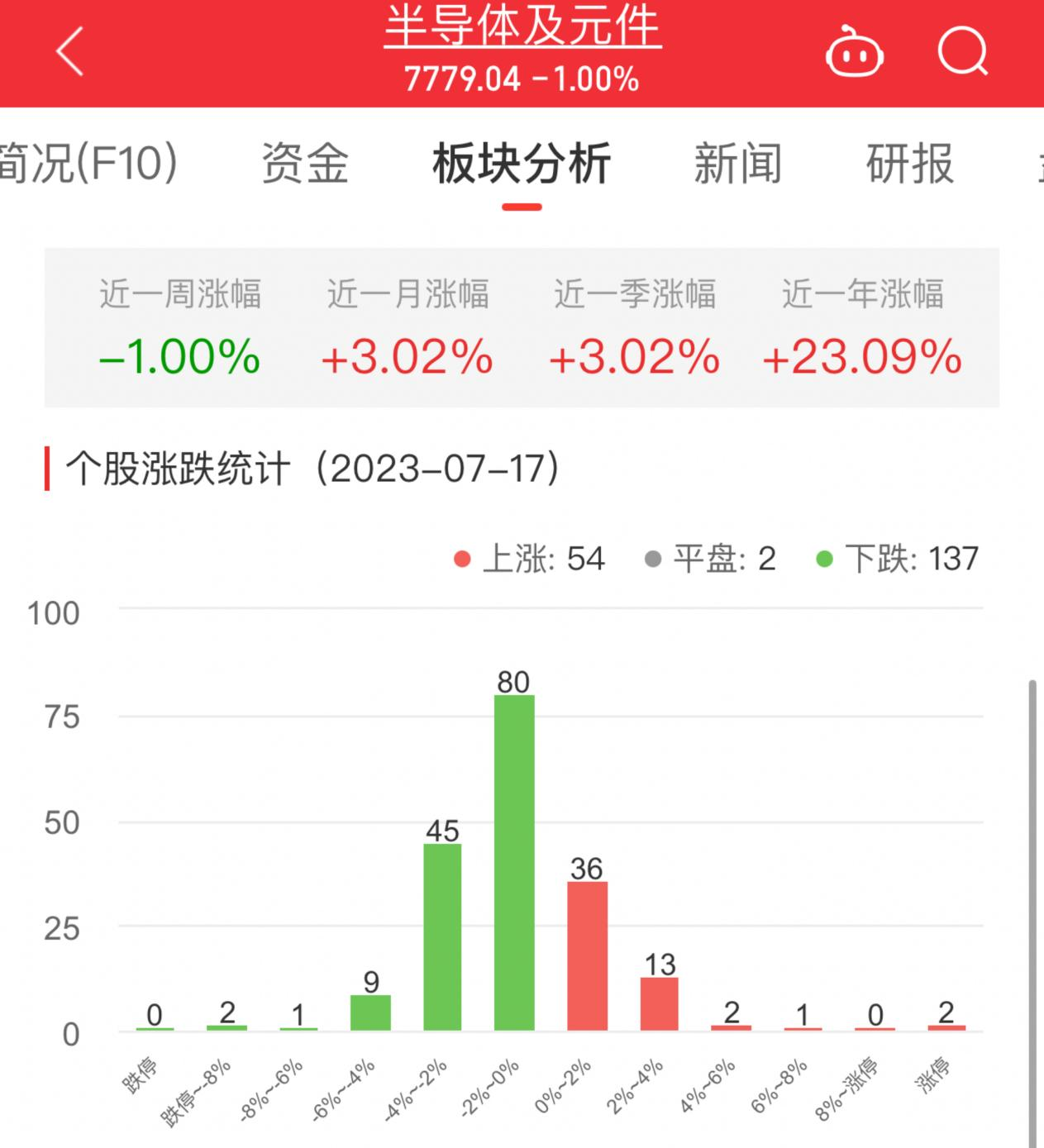 中国经济网北京7月17日讯 今日,半导体及元件板块整体跌幅1.00%,其中54只股票上涨,2只股票平盘,137只股票下跌。