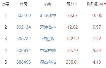 其中,汇顶科技、天津普林、卓胜微、中富电路、源杰科技位列板块涨幅前五位,涨幅分别为10.00%、9.97%、7.22%、5.54%、4.13%。