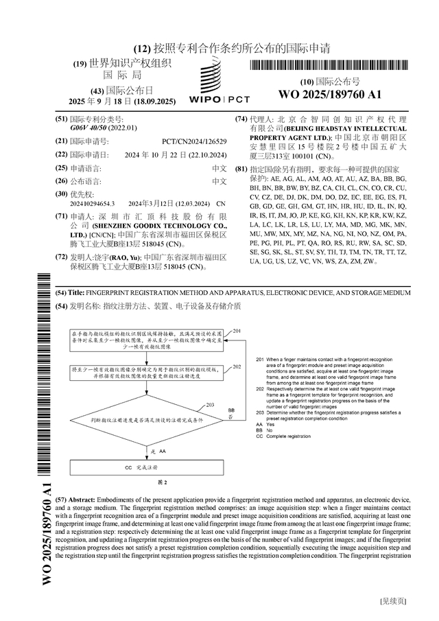 汇顶科技公布国际专利申请:“指纹注册方法、装置、电子设备及存储介质”