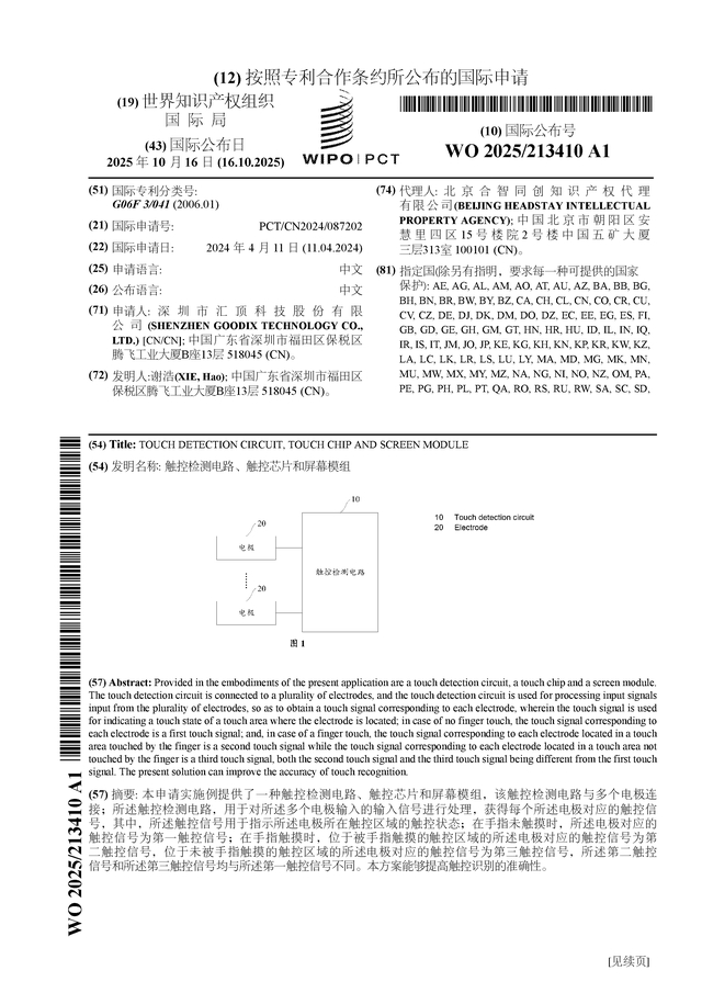 汇顶科技公布国际专利申请:“触控检测电路、触控芯片和屏幕模组”