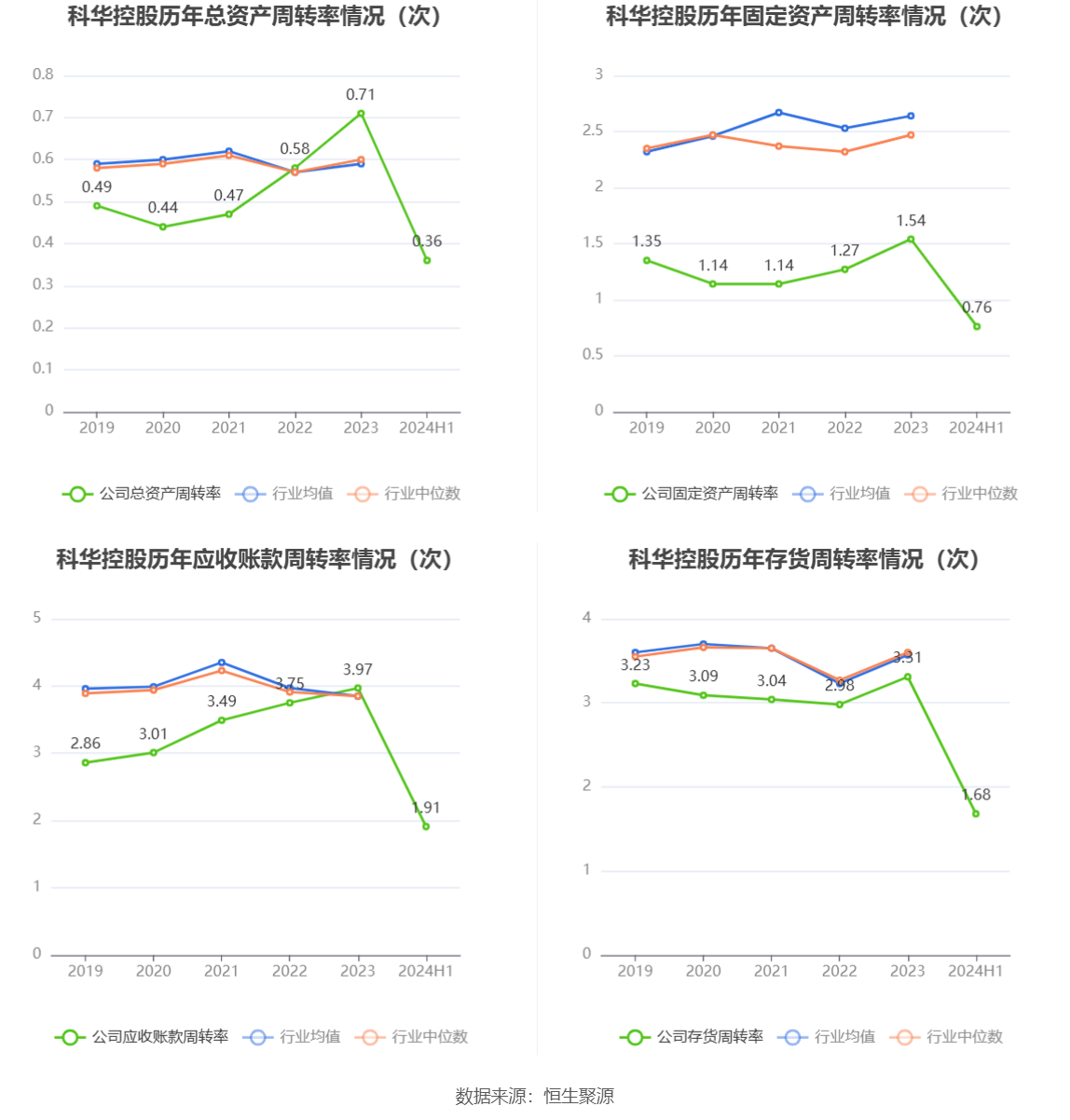 营运能力方面,2024年上半年,公司公司总资产周转率为0.36次,上年同期为0.33次(2023年上半年行业平均值为0.28次,公司位居同行业29/99);固定资产周转率为0.76次,上年同期为0.71次(2023年上半年行业平均值为1.29次,公司位居同行业82/99);公司应收账款周转率、存货周转率分别为1.91次、1.68次。