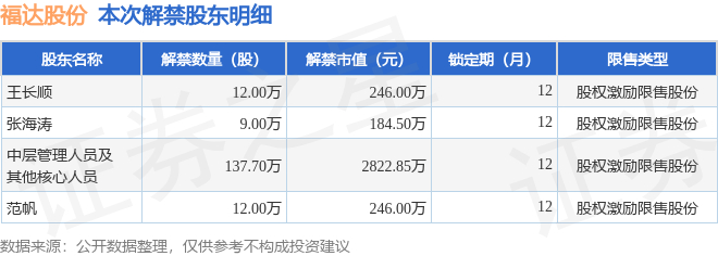 福达股份(603166)170.7万股限售股将于10月13日解禁,占总股本0.26%