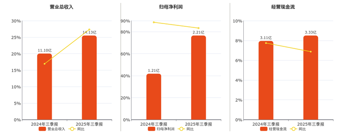 公司营业总收入为14.13亿元。归母净利润为2.21亿元。经营活动现金净流入为3.33亿元。
