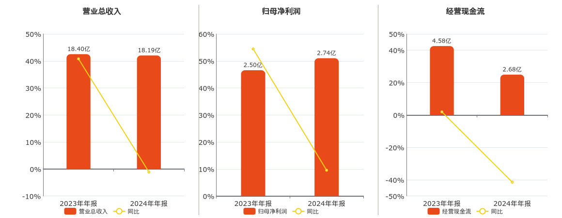 公司营业总收入为18.19亿元。归母净利润为2.74亿元,较去年同报告期归母净利润增加2388.02万元,实现2年连续上涨,同比较去年同期上涨9.54%。经营活动现金净流入为2.68亿元。