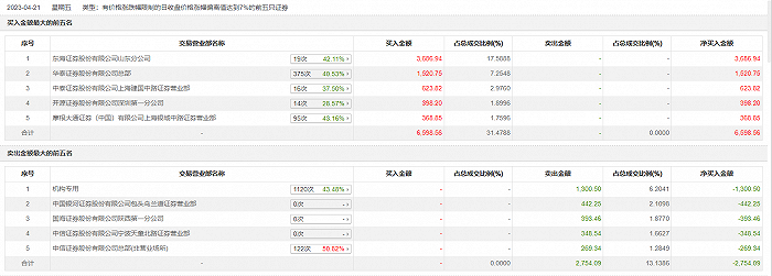 具体来看,机构合计净卖出1300.5万元。此外,东海证券山东分公司、华泰证券总部分别买入3686.94万元、1520.75万元;中国银河证券包头乌兰道证券营业部、国海证券陕西第一分公司分别卖出442.25万元、393.46万元。