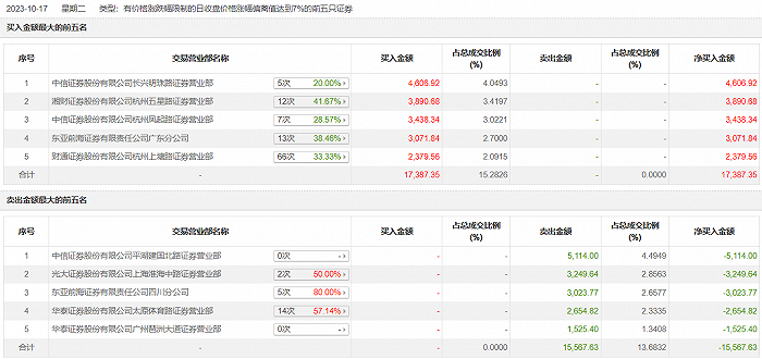 莎普爱思10月17日涨停,全天换手率达22.99%,振幅达2.94%。龙虎榜数据显示,营业部席位合计净买入1819.72万元。其中,中信证券长兴明珠路证券营业部、湘财证券杭州五星路证券营业部分别买入4606.92万元、3890.68万元;中信证券平湖建国北路证券营业部、光大证券(维权)上海淮海中路证券营业部分别卖出5114.00万元、3249.64万元。