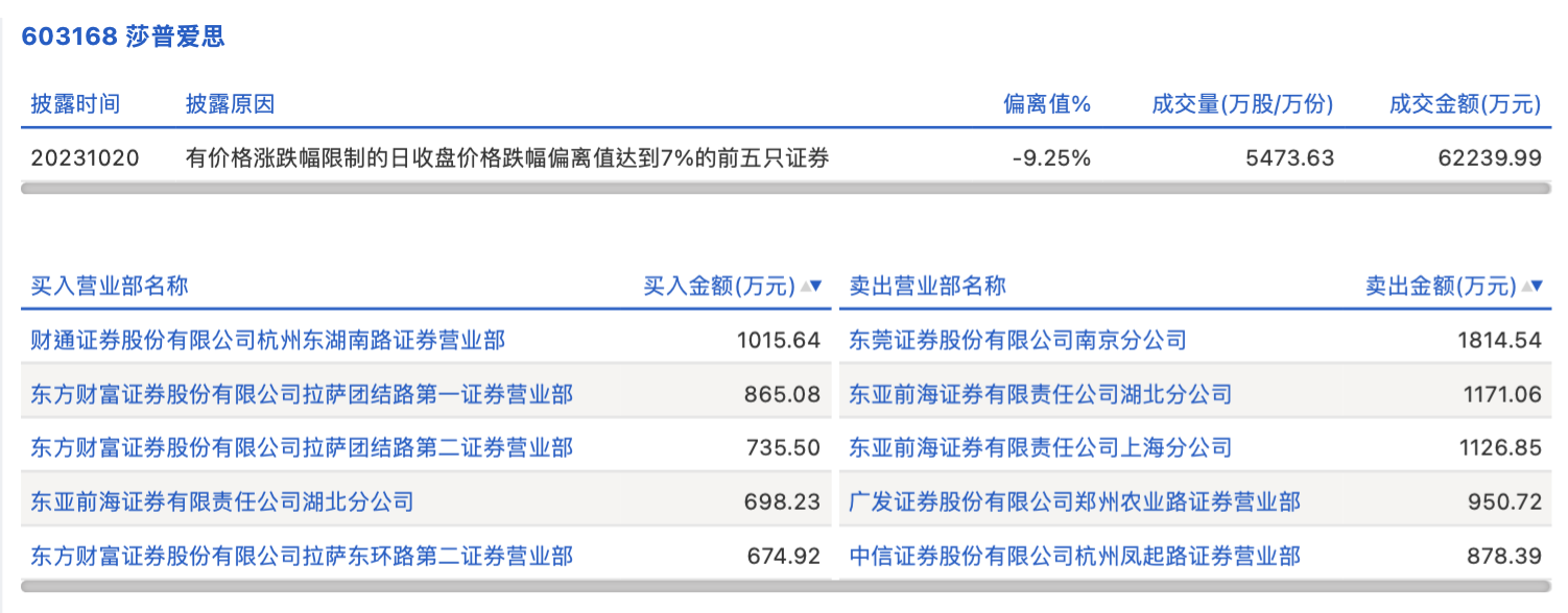 10月20日,莎普爱思今日跌停,全天换手率达16.97%,振幅达4.72%。龙虎榜数据显示,营业部席位合计净卖出1952.19万元。其中,东莞证券南京分公司、东亚前海证券湖北分公司分别卖出1814.54万元、1171.06万元;财通证券杭州东湖南路证券营业部、东方财富证券拉萨团结路第一证券营业部分别买入1015.64万元、865.08万元。