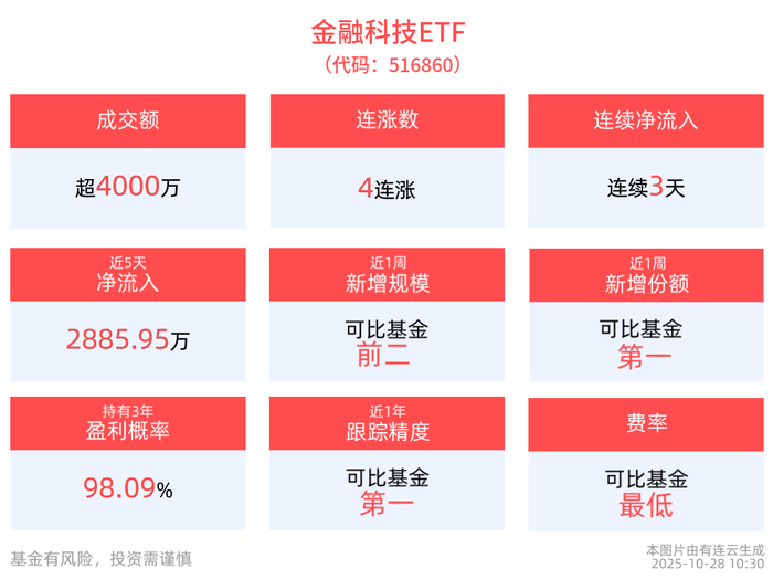 截至2025年10月28日10:30,中证金融科技主题指数上涨0.45%,成分股税友股份上涨10.00%,恒宝股份上涨5.99%,格尔软件上涨5.94%,星环科技上涨3.97%,信安世纪上涨3.39%。金融科技ETF(516860)上涨0.59%,冲击4连涨。最新价报1.53元。拉长时间看,截至2025年10月27日,金融科技ETF近1周累计上涨3.68%。