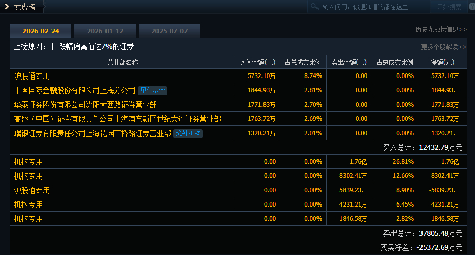 税友股份今日跌停,有4家机构专用席位净卖出3.20亿元