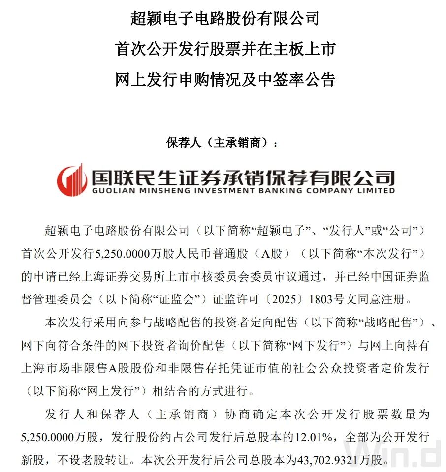 项乾消息:10月15日,超颖电子(603175.SH)开启申购,申购代码732175,申购价格每股17.08元。根据当晚的申购结果,回拨机制启动后,网下最终发行数量为1468.42万股,网上最终发行数量为3079万股,网上发行最终中签率为0.02860900%。