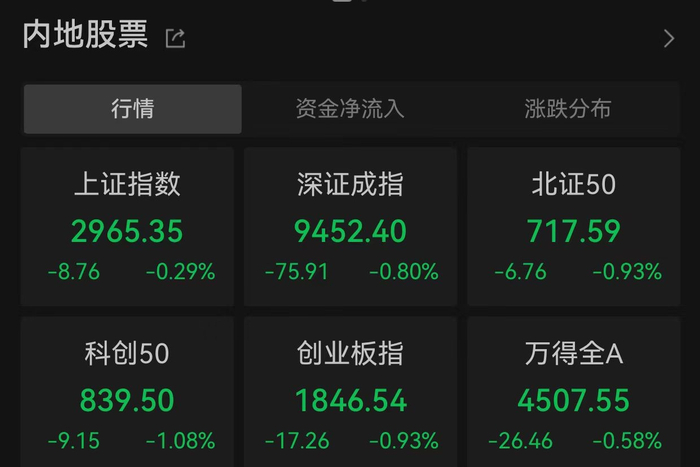 截至午盘,上证指数跌0.29%,报2965.35点;深证成指跌0.80%,报9452.40点;创业板指跌0.93%,报1846.54点。