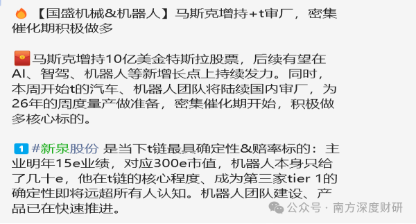 此外,驱动公司股价走强的最大看点是机器人业务,小作文传新泉股份是特斯拉链最具确定性和赔率标的:主业明年15亿业绩,对应300亿市值,机器人本身只给了几十亿,他在特斯拉链的核心程度、成为第三家tier 1的确定性即将远超所有人认知。