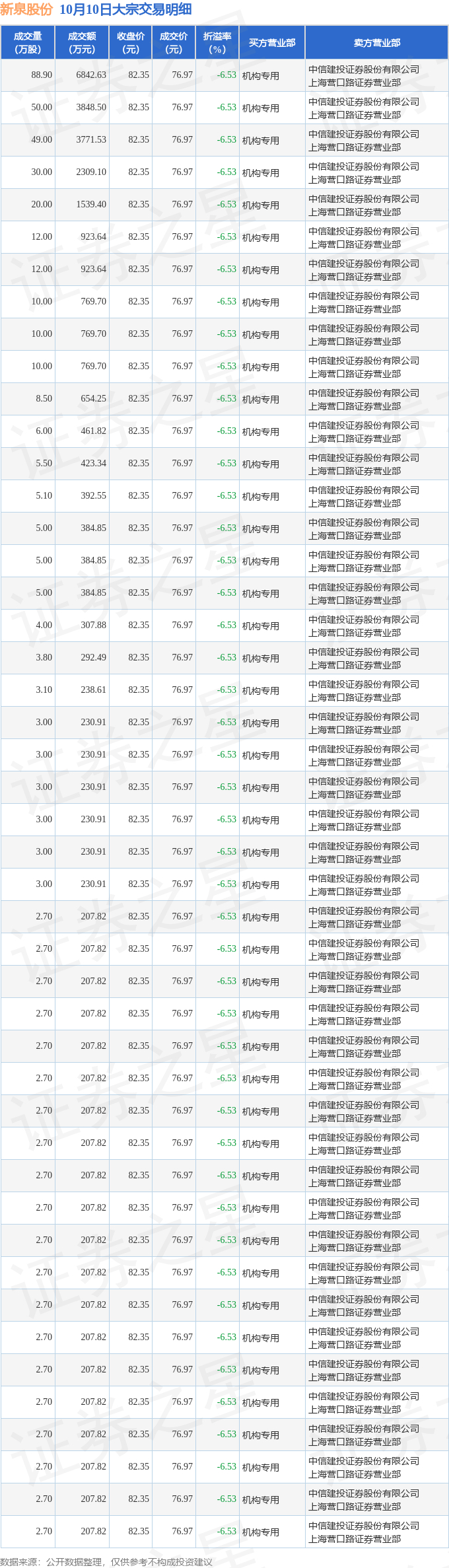 10月10日新泉股份现46笔大宗交易 机构净买入3.19亿元