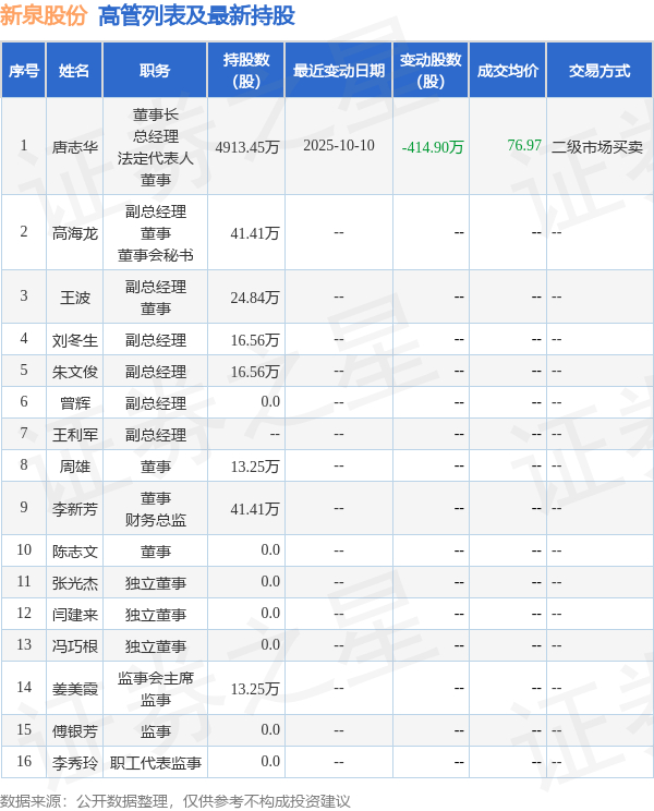 新泉股份近半年内的董监高及核心技术人员增减持详情如下: