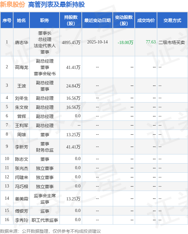 新泉股份近半年内的董监高及核心技术人员增减持详情如下:
